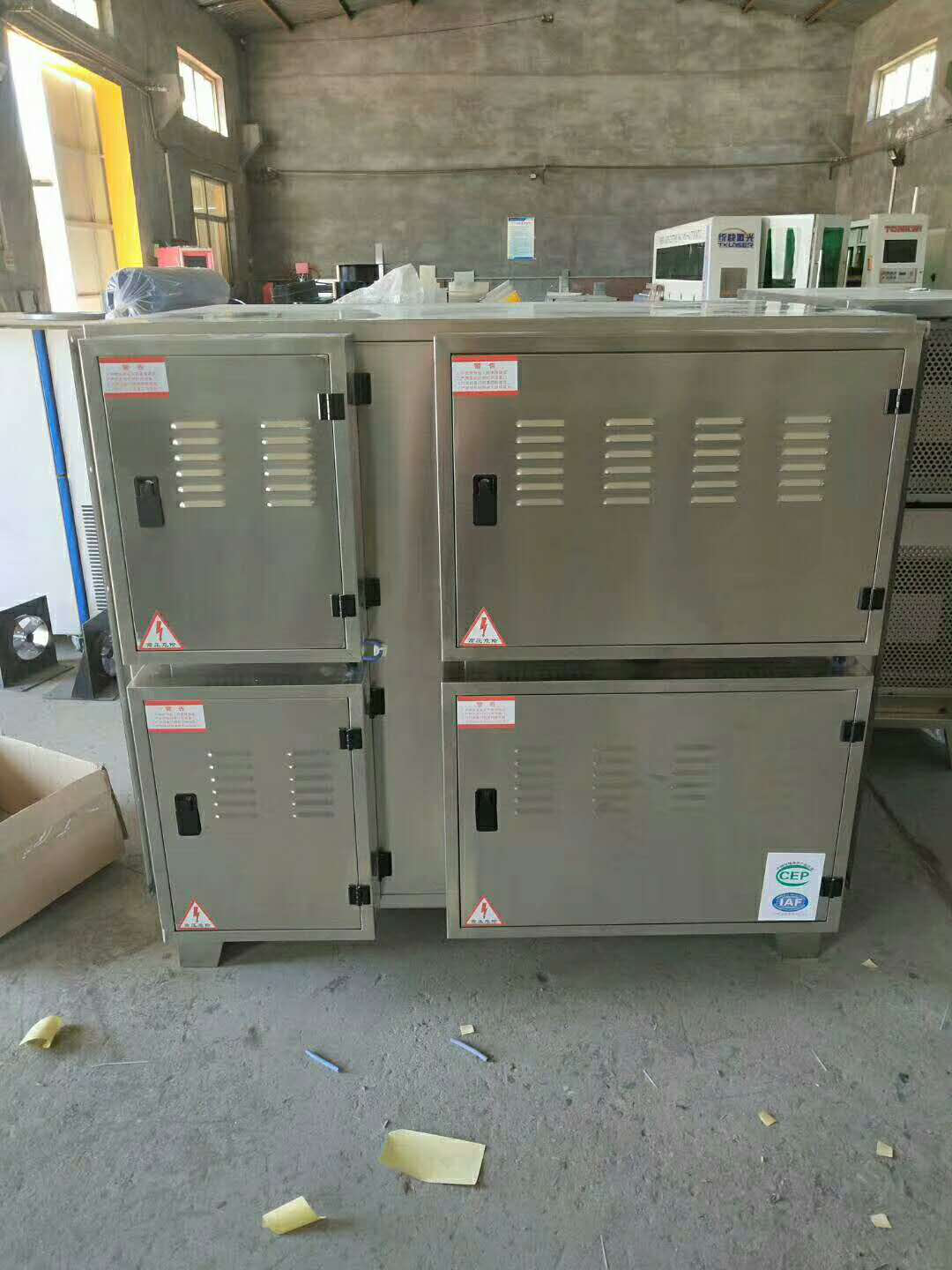 產品說明:低空排放靜電式油煙凈化設備,適用于飲食業、工廠車間所產 生的油煙及工業廢氣,異味等凈化治理。廢氣通過管道進入預處理層進行煙氣分流,分流后均勻的氣體流向整個電場極板層。在電場極板層上的電暈過程發生于活化的高壓電極和接地電極之間,電極之間的空間內形成高濃度的氣體離子,廢氣 通過這個空間時,油塵粒子在百分之幾秒的時間內因碰撞俘獲氣體離 子而荷電,在電場力的作用下,把油塵吸附在電場的集污板上。同時 髙壓窄脈沖電壓發生器產生的前沿陡綃、脈沖窄(納秒級)的高壓脈 沖電暈放電,在常溫常壓下獲得非平衡等離子體,產生大量高能電子 和等活性粒子,對有機物分子進行氧化降解反應,使污染物 最終轉化為無害物。達到油煙塵凈化、除味、殺菌作。